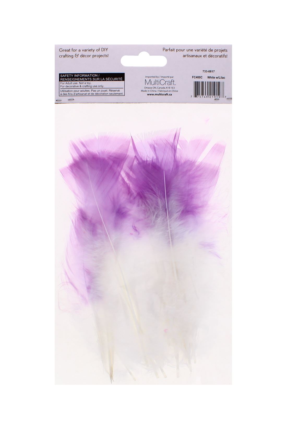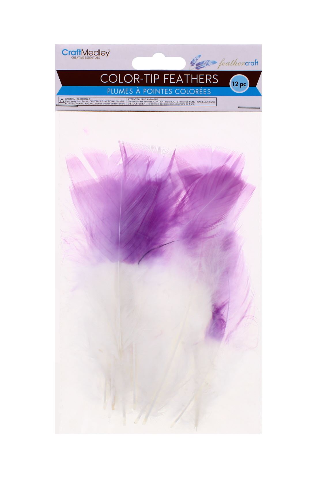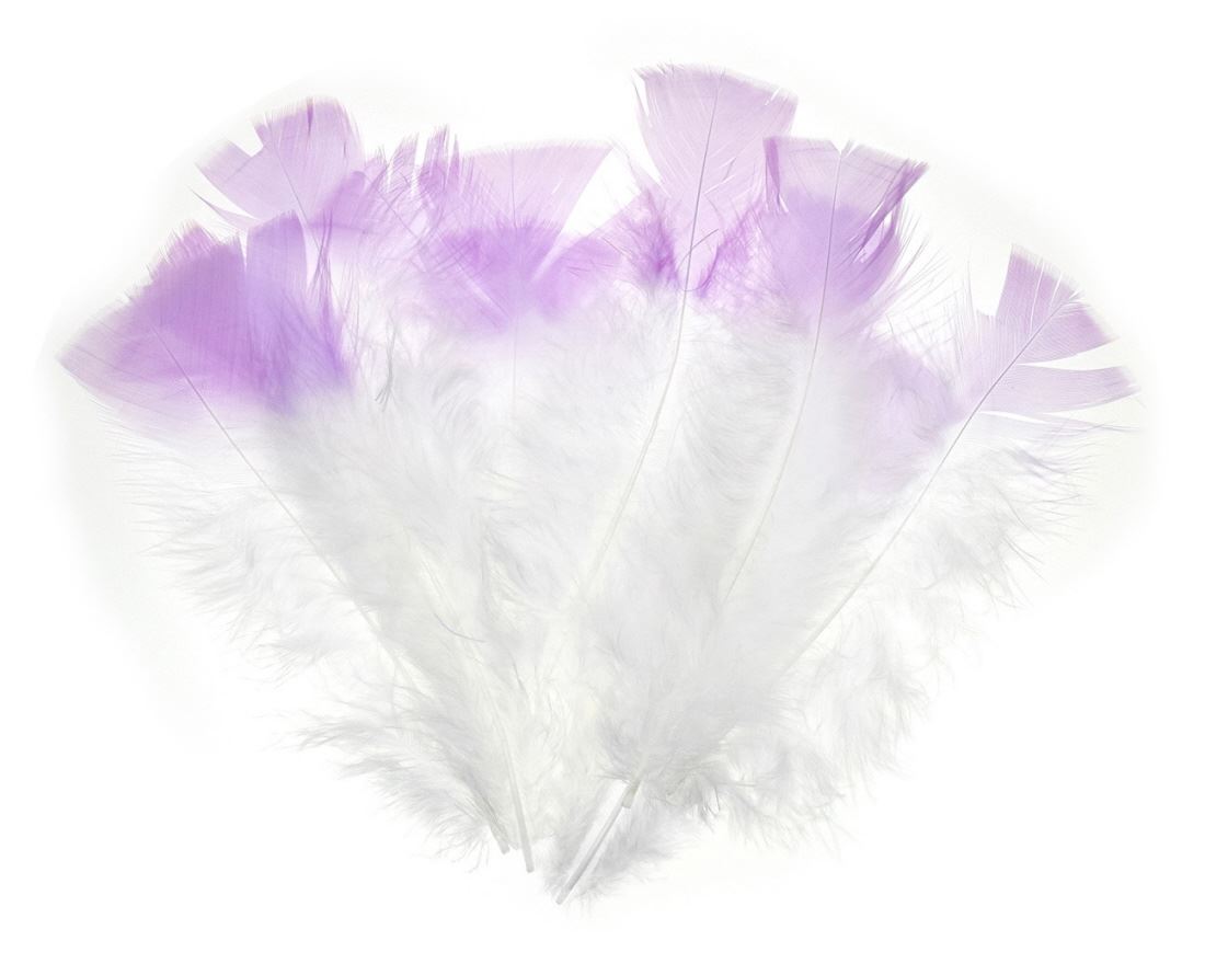 White craft feathers with lilac-tipped ends for delicate and colourful decoration.