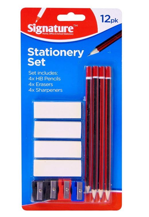 A comprehensive stationery pack with 12 items, perfect for school supplies, homework, and creative projects.