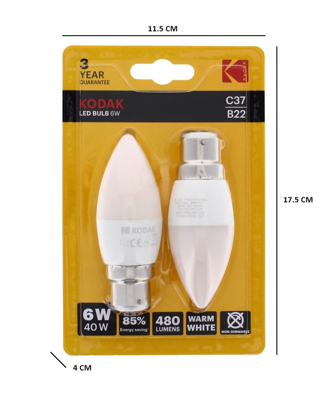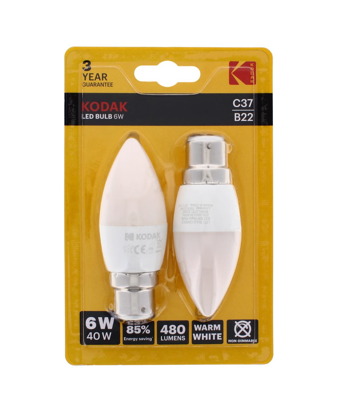2PK KODAK LED BULB CANDLE B22 BAYONET 6W WARM WHITE