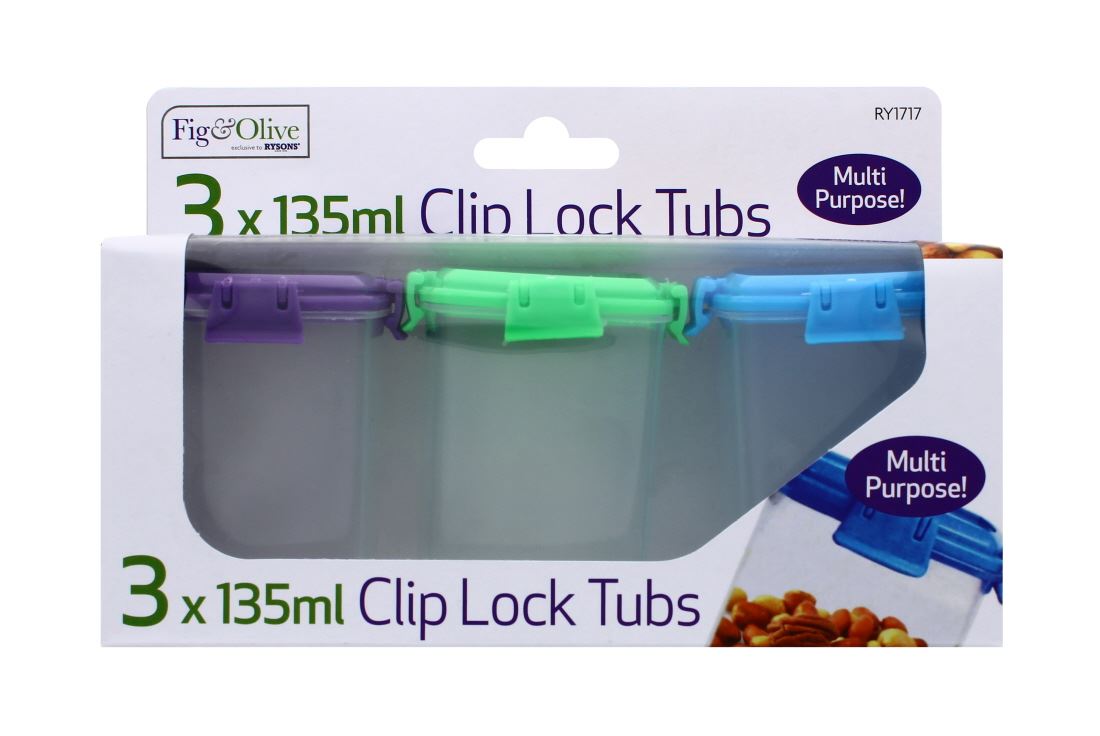 Set of 3 clip lock tubs with 135ml capacity, ideal for storing small amounts of food or condiments securely.