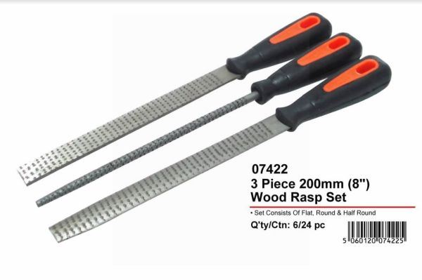 Designed for woodworking professionals and hobbyists, this 3-piece rasp set is perfect for shaping and smoothing wood surfaces.