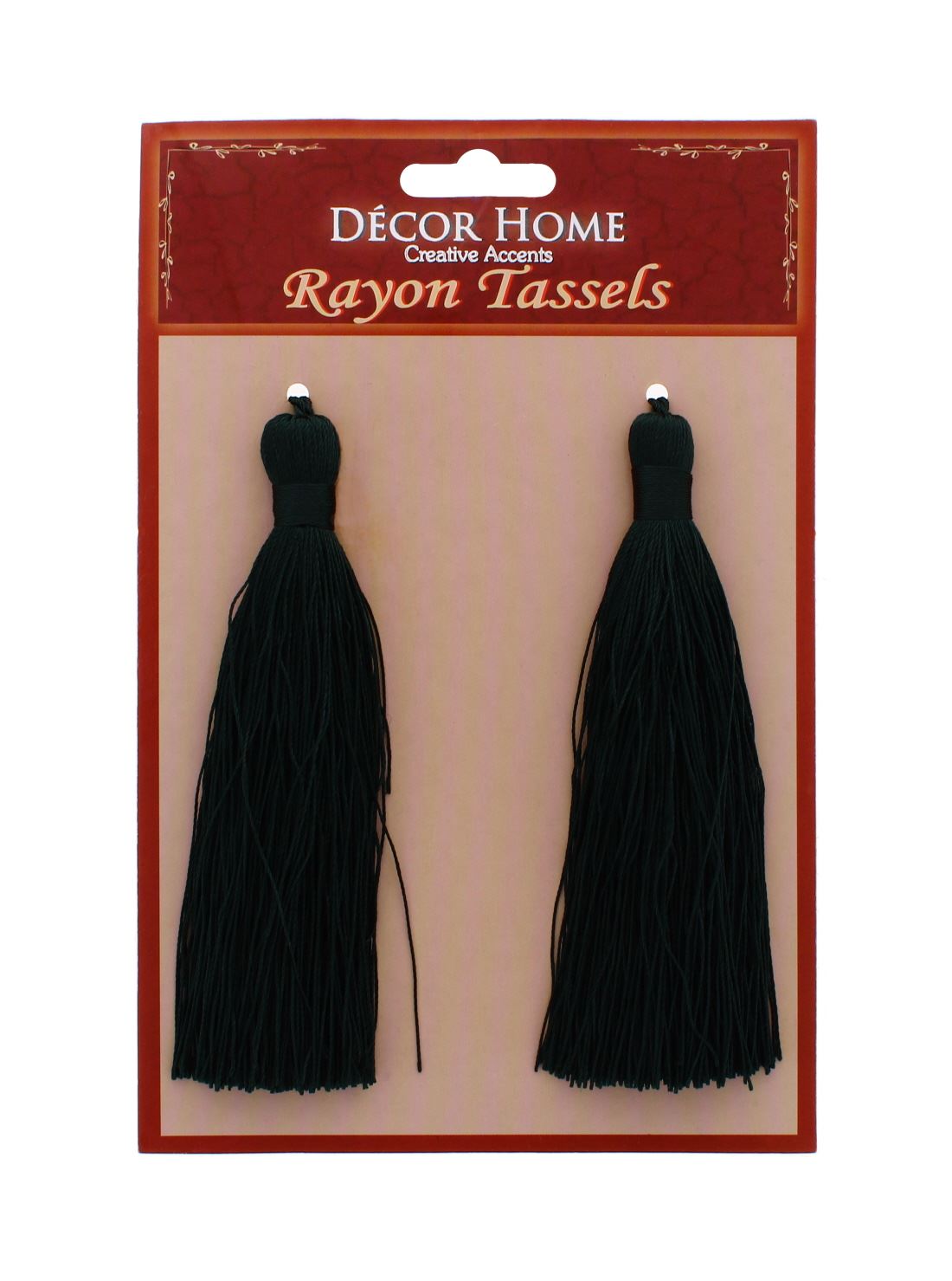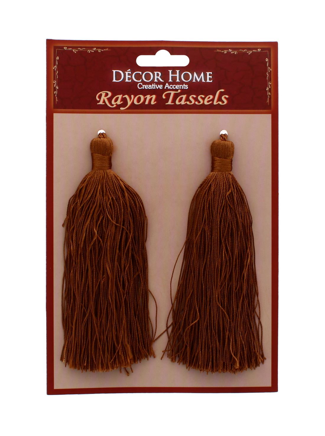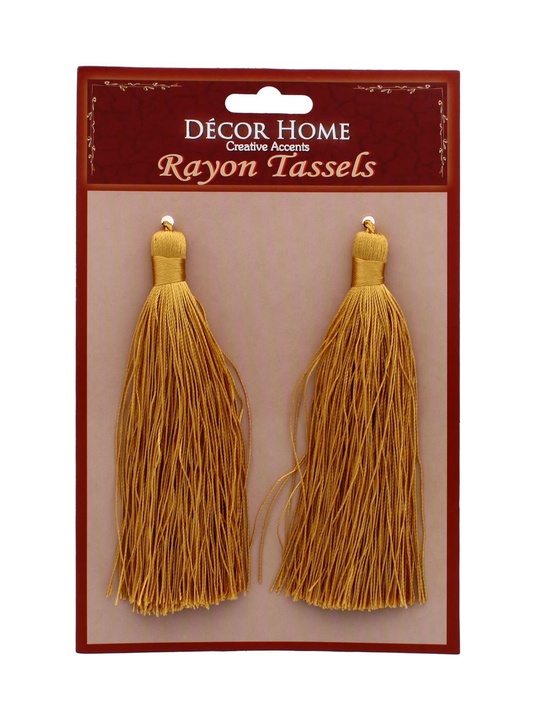 Decorative rayon tassels with trim detailing, perfect for enhancing garments or craft projects.