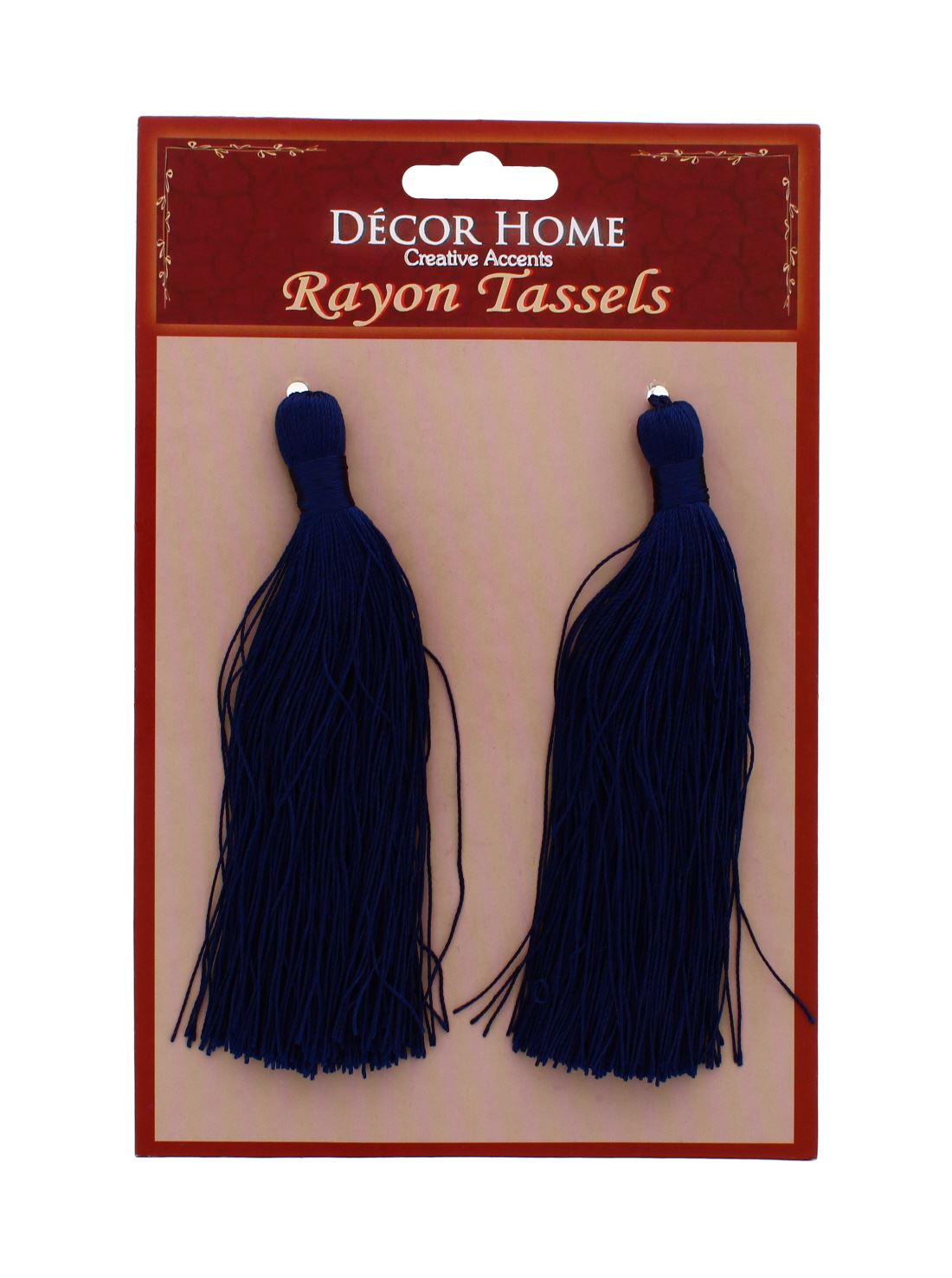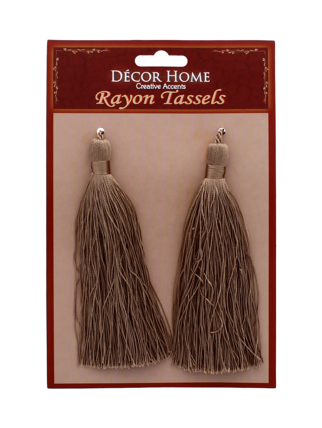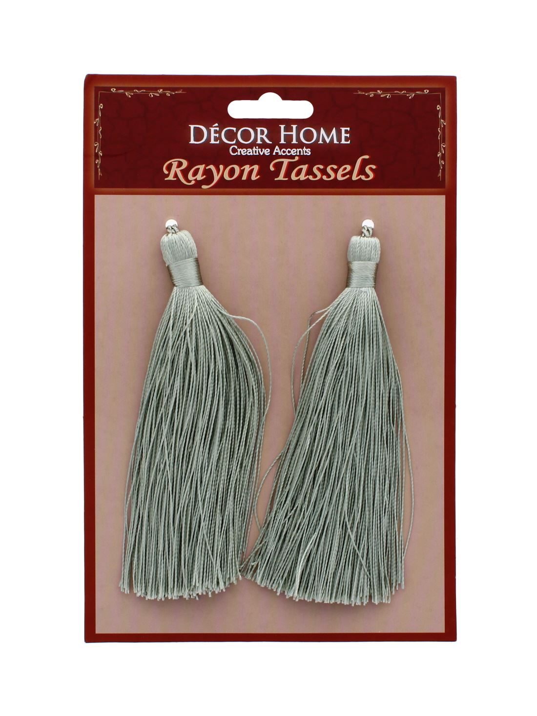 Decorative rayon tassels with trim detailing, perfect for enhancing garments or craft projects.