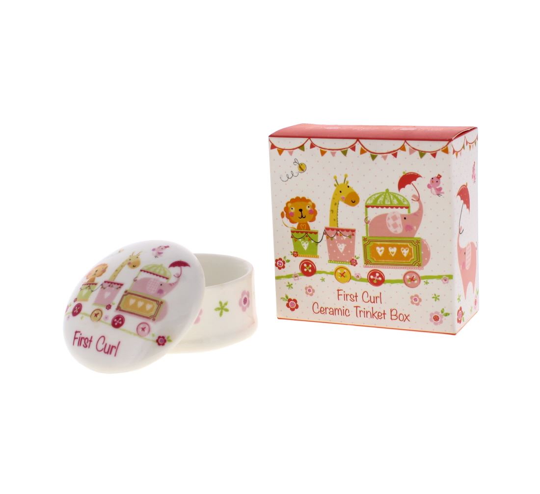 Elegant ceramic trinket box designed to store a baby girl’s first curl. A sentimental keepsake perfect for gifting to new parents.