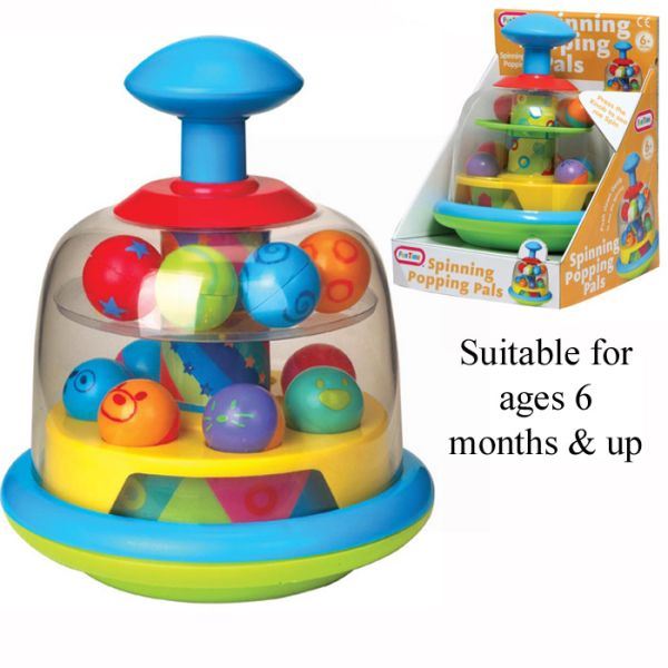 Interactive baby toy with spinning and popping features to stimulate senses and motor skills.