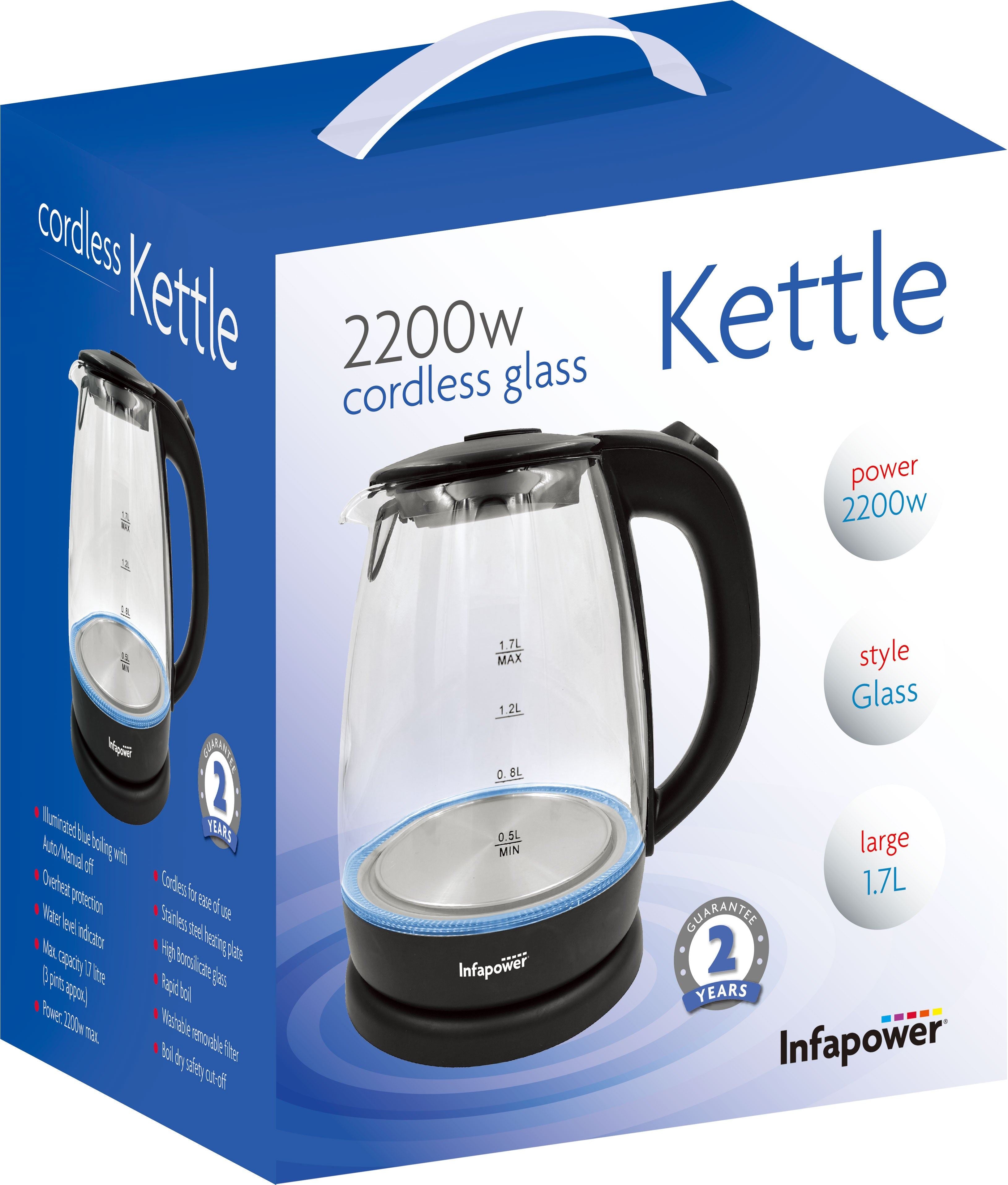 A sleek glass cordless kettle with 2200W power for quick boiling and modern style.