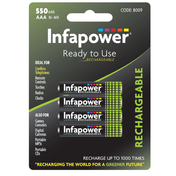 Reliable pack of 4 AAA rechargeable Ni-MH batteries for everyday devices.