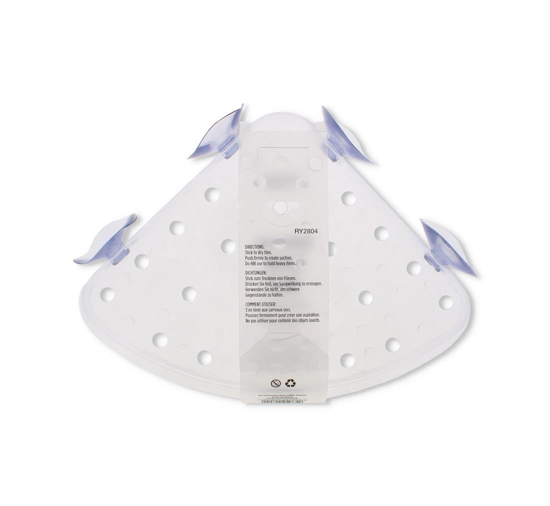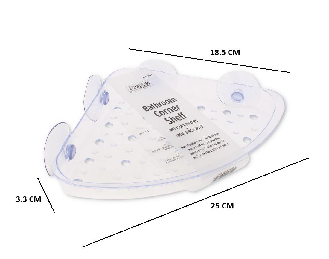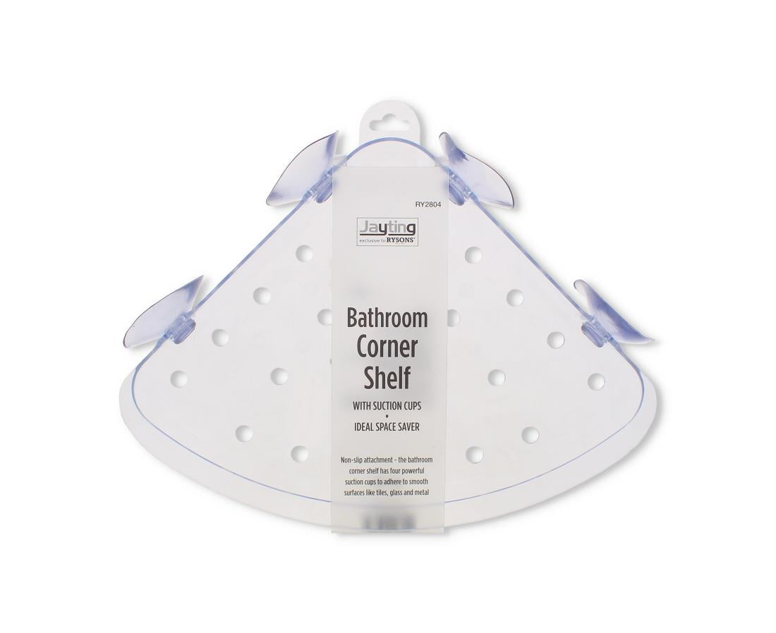 Space-saving suction corner shelf ideal for shower or bathroom corners.